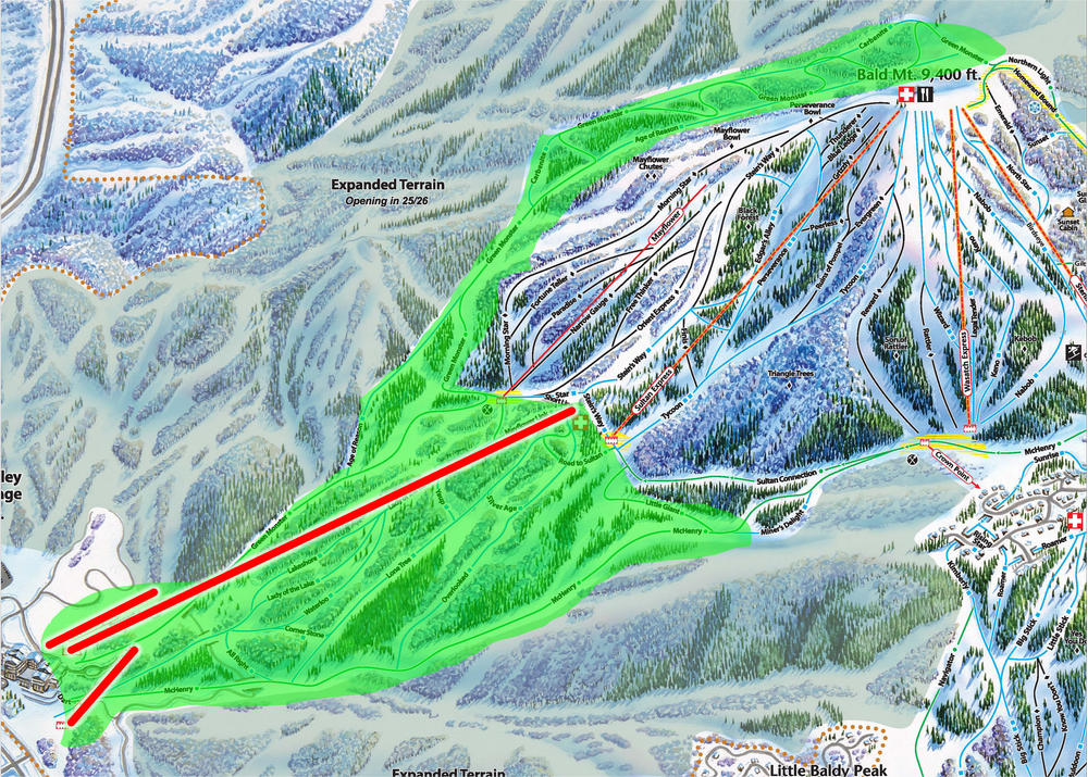 The new Deer Valley Expanded Excellence terrain for the 2024-25 season, with the three new lifts highlighted in red. The nearby terrain shaded in light green is expected to open for the 2025-26 season.